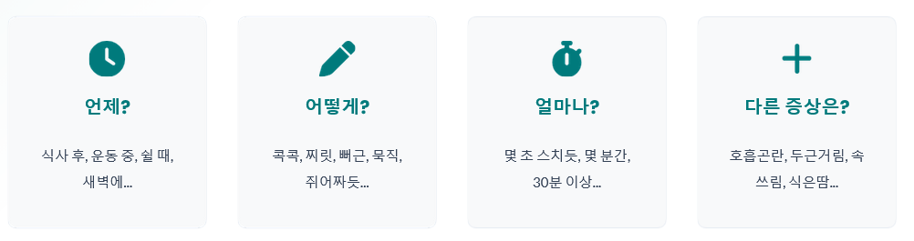 - 다른 증상은? (호흡곤란, 두근거림, 속 쓰림, 식은땀...)