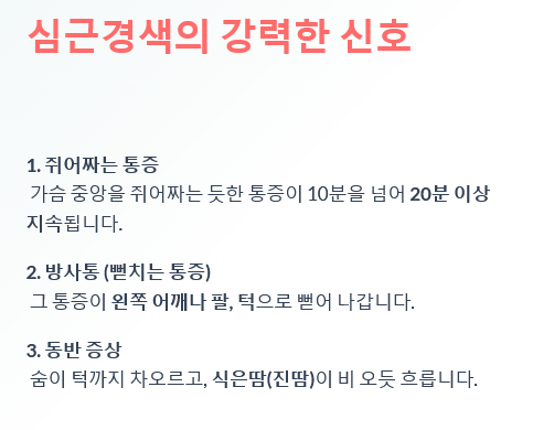 이건 1초도 망설이시면 안 됩니다. "괜찮아지겠지" 하다가 골든타임을 놓칩니다. 이건 '심근경색'의 강력한 신호일 수 있으니, 즉시 119 🚑에 전화하세요! (절대 혼자 운전해서 가거나 택시 잡으시면 안 됩니다! 구급차 안에서 응급처치를 받아야 해요!)